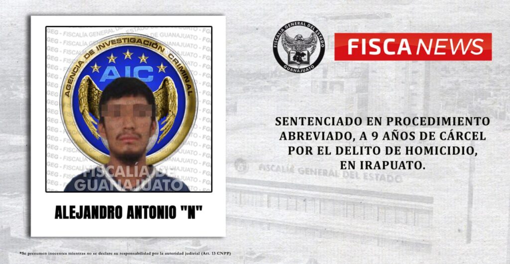 Irapuato, Gto. – “El Jando”, un sujeto llamado ALEJANDRO ANTONIO “N”, ha sido sentenciado en procedimiento abreviado a 9 años de cárcel, luego de que la Fiscalía de Guanajuato investigó y acreditó ante un Juez, la responsabilidad de este individuo en la muerte de Fabián Isaías “N”, a quien atacó con un objeto punzo cortante, el domingo 8 de enero de 2023, cuando se encontraba en la calle Misericordia de la comunidad Tomelopitos, en Irapuato.