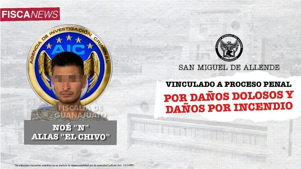 NOÉ “N” alias “El Chivo”, fue detenido por elementos de la AIC y llevado a audiencia, donde, en razón de los datos de prueba presentados por el Ministerio Público fue vinculado a proceso penal por el delito de daños por incendio y daños dolosos.